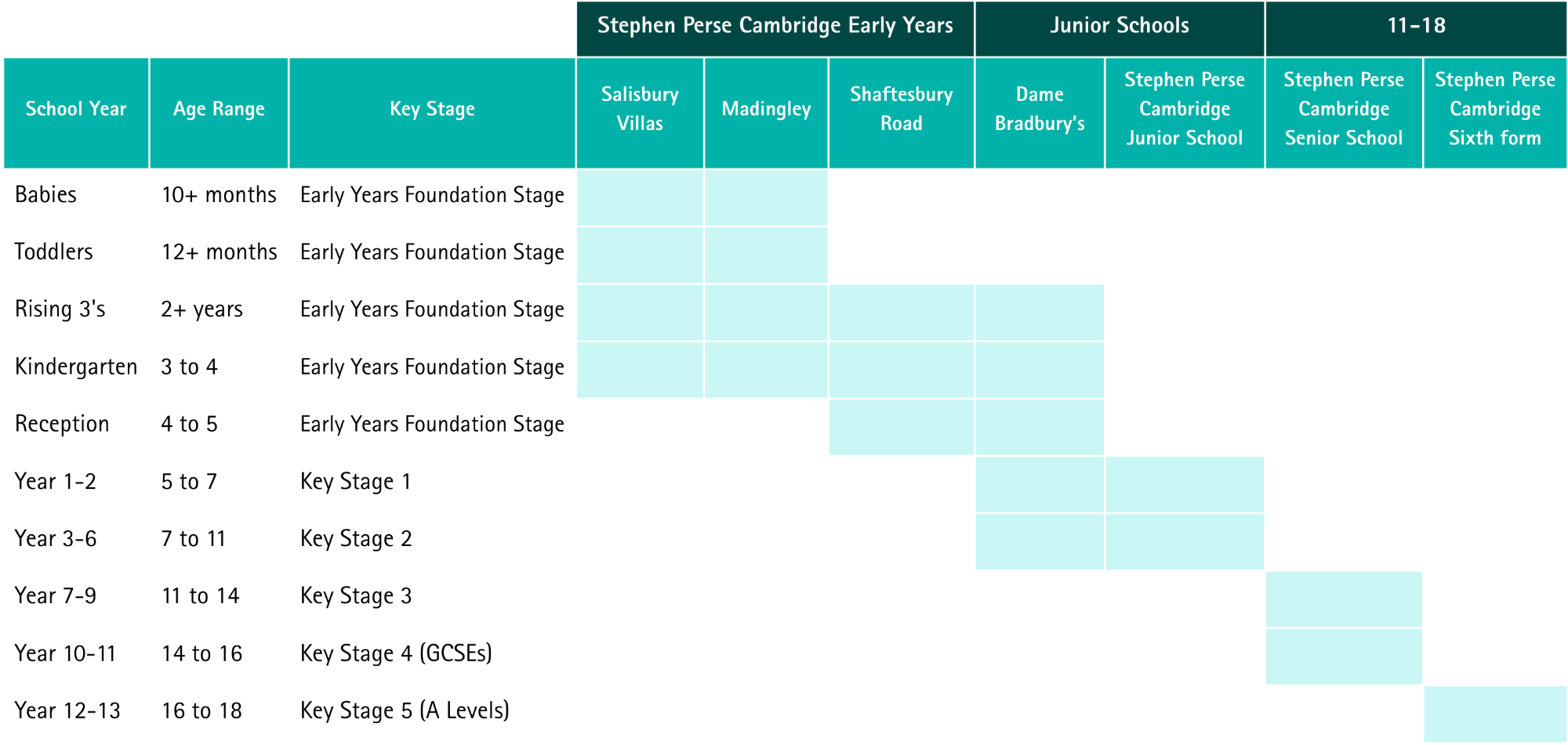 Our family of schools covers all year groups and key stages – use this guide to find the right location for each age group.