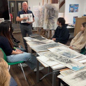 Our sixth form students were lucky enough to take part in a drawing techniques workshop, led by well-known and celebrated artist Ian Murphy. Over the course of the day, students learned about the artist’s process of working from initial sketchbook drawings, to larger scale experimental works on paper and finally to oil painted canvases. Students commented that it was really helpful and inspiring to have in-depth teaching over the whole day where they learned about building textured backgrounds, overlaid with dripped inks and pen drawings. Their outcomes were fantastic!